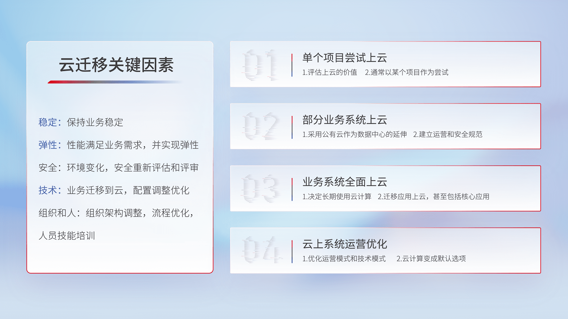 结合实际业务,,,从规划设计、、、云平台选型、、、、云原生改造、、数据迁移、、集成交付,,,,迁移全过程为客户识别最佳上云路径,,做好风险识别管理,,,,设计网络架构、、身份权限、、、、安全审计合规、、操作审计、、日志审计、、、、监控告警策略、、多站点容灾设计等,,,,对云上基础设施进行整体规划,,,,提升IT治理水平,,,,以满足弹性、、、、高可用、、、高性能的需求。。。