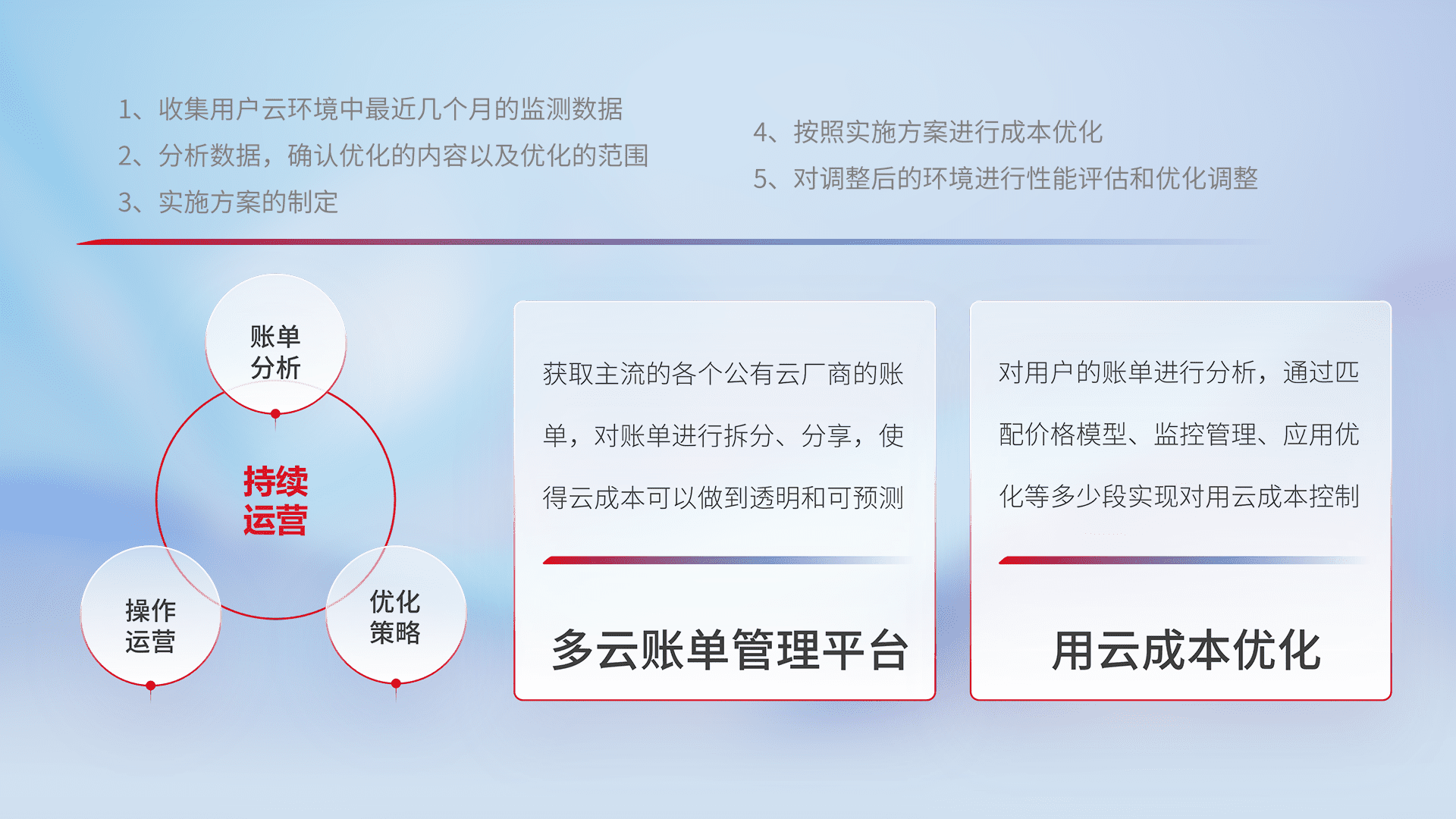 通过多云纳管,,,以统一的资源数据模型把客户的云资源进行抽象和封装,,,,进而实现对多云资源的统一操作,,,保障云资源管理的可靠性、、、、稳定性与可用性。。。。量身定制化运维内容,,,配置、、开发运维、、补丁管理、、备份、、监控、、、认证和访问管理、、、审计和日常巡检等,,保障在用云过程中的可靠度,,稳定度以及高可用率。。。